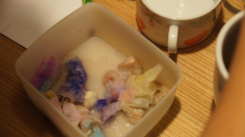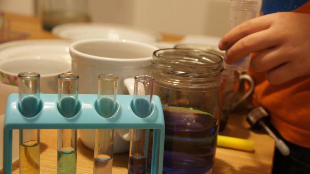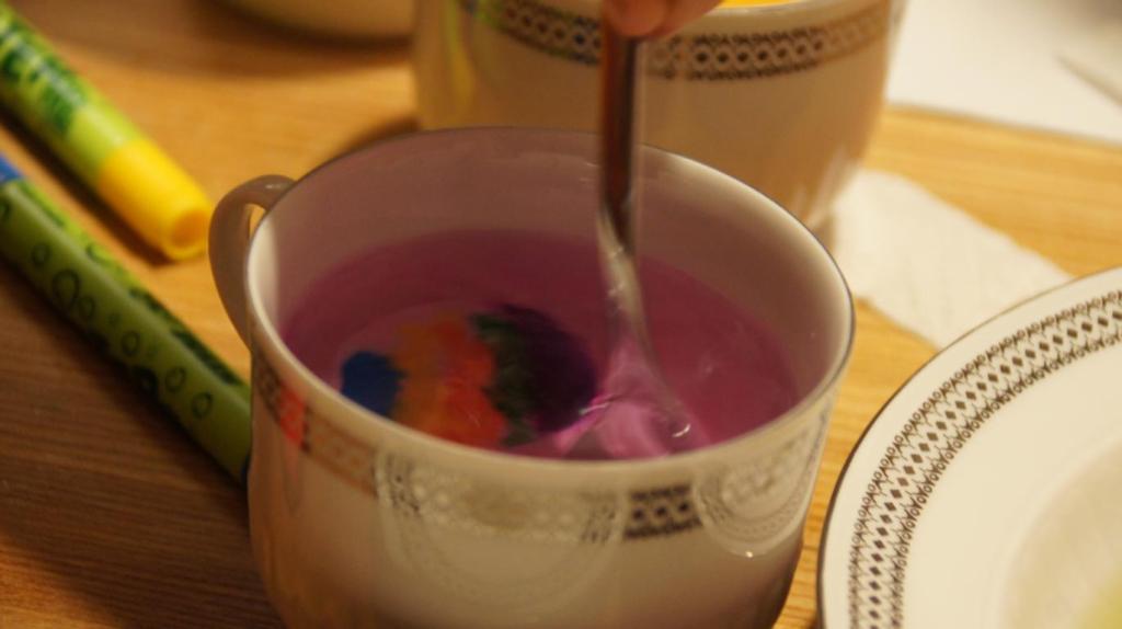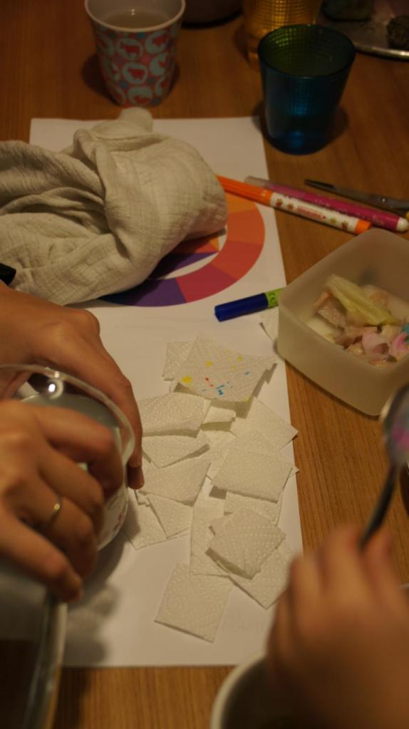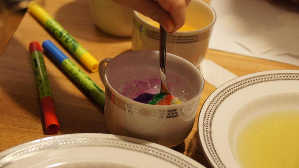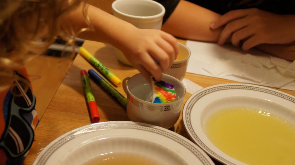 Die Herzkönigin und der kleine Prinz haben offenbar eine Vorliebe für Pritscheleien, gemeinhin Wasserspiele genannt. Hier wird mit Farben experimentiert, die man auf ein Stück Küchenrolle aufmalt und die dann im Wasser neue Farbvariationen entstehen lassen.