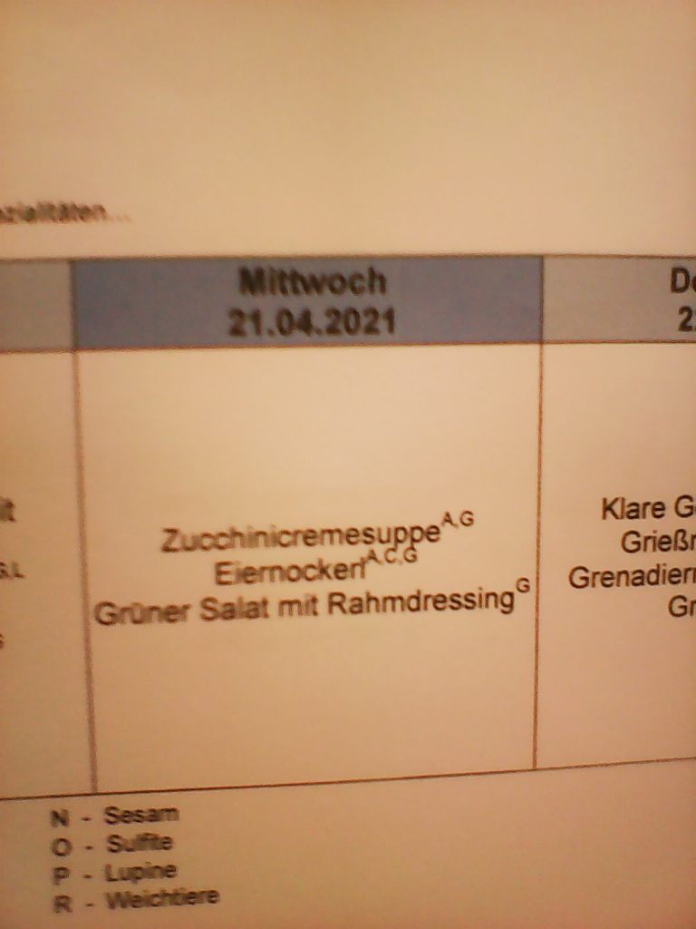 Der Herzkönig rätselt ob bzw. was einem der Kindergarten mit dem Speiseplan für den 21. April sagen wollte….. Hoffentlich wird der Speiseplan im nächsten Jahr geändert, denn dann fällt der Mittwoch auf einen 20.