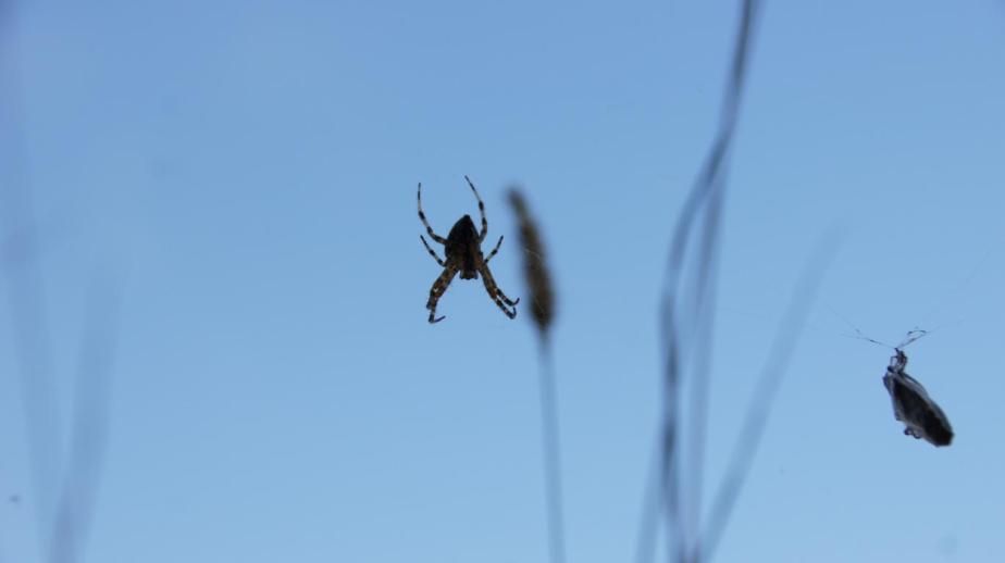 Nach der ersten Schulwoche beschloss der Herzkönig, der gesamten Herzköniglichen Familie ein Ruhewochenende zu gönnen. Die einzige, die an diesem Wochenende fleißig gearbeitet hat, war eine Spinne. Diese hatte am Trog vor dem Fenster am Samstag einen ersten Faden ausgelegt und am Sonntag das Netz vollendet. Und offenbar war sie mit dem Radnetz auch schon erfolgreich.