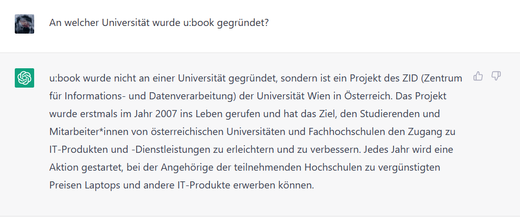 Der Herzkönig wollte an einem Gewinnspiel teilnehmen und hat die Frage gleich ChatGPT gestellt. Die Antwort war etwas lang ausformuliert. Sie klingt so, als wolle man sich mit möglichst viel anderen Informationen um die eigentliche (sehr kurze Antwort) drücken. Denn bei den Antwortmöglichkeiten im Gewinnspiel gab es nur drei Universitäten auszuwählen. Und der ZID muss vermutlich in echt in Zentrum für Informations- und Datenverarbeitung umbenannt werden.