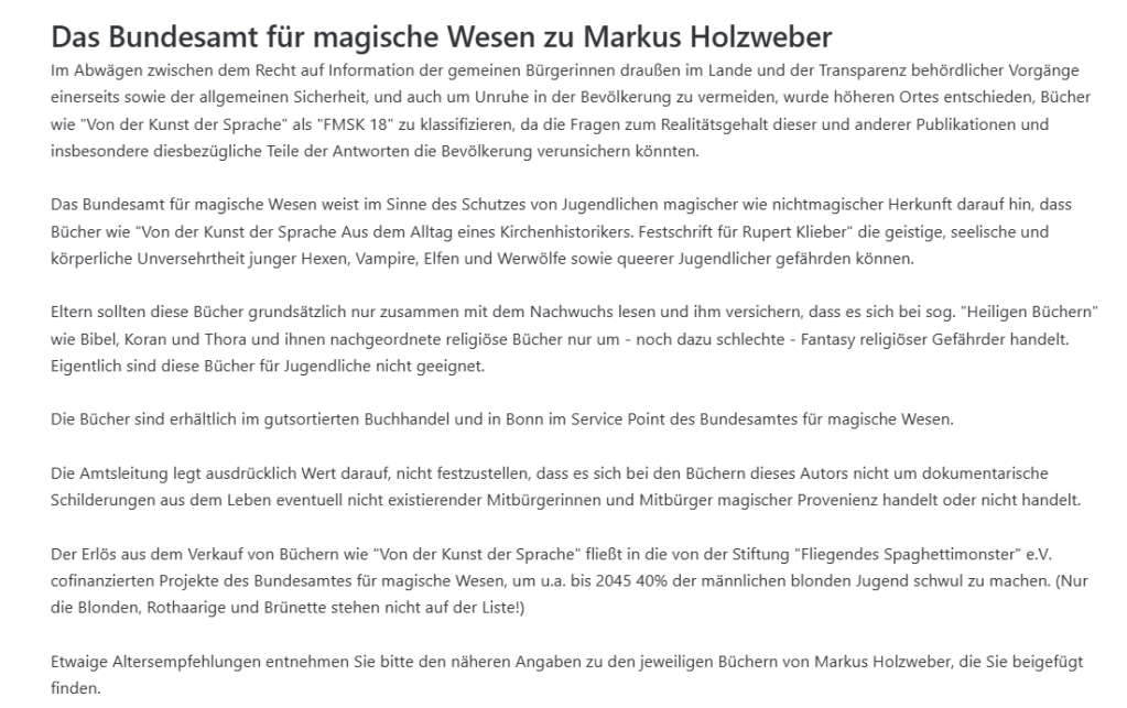 Undenkbar, aber doch passiert. Ein Buch des Herzkönig, die Festschrift „Von der Kunst der Sprache“ ist auf den Index gesetzt worden! Offenbar kann durch das Lesen die „die geistige, seelische und körperliche Unversehrtheit junger Hexen, Vampire, Elfen und Werwölfe sowie queerer Jugendlicher“ gefährdet werden, oder sogar „Unruhe in der Bevölkerung“ entstehen.
