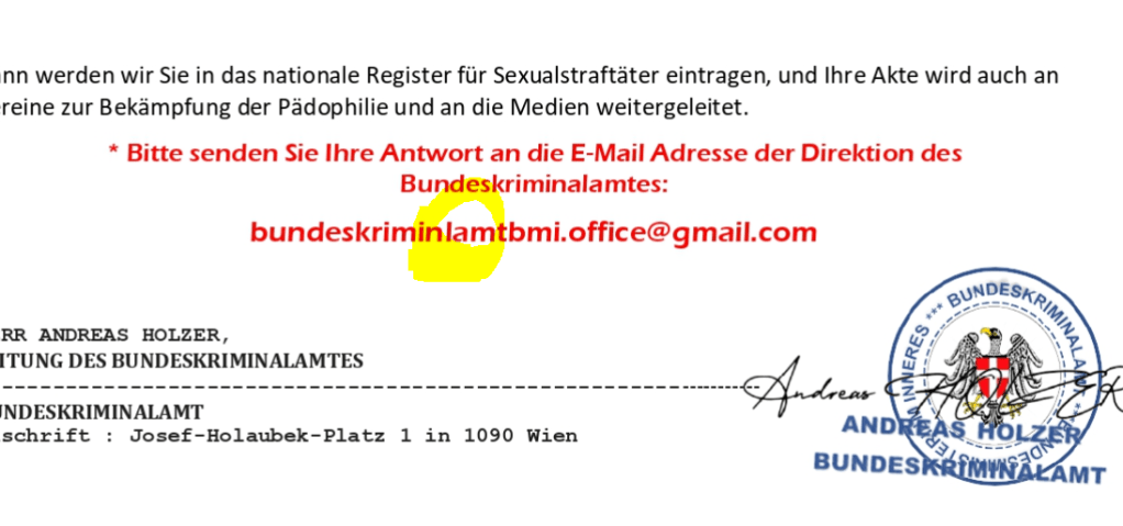 Waren früher Spam-Mails durchaus positiv besetzt (man offerierte Sessel, potenzsteigernde Mittel oder auch einfach Millionen aus einer Erbschaft), so tauchen nun wieder bedrohliche Spams auf, die furchtbar einschüchternd Straftaten vorzuwerfen scheinen. Es ist aber doch davon auszugehen, dass sich das Bundeskriminalamt eine ordentliche E-Mail-Adresse leisten kann (und keine gmail-Adresse) und dass man es zumindest schafft, das Wort Bundeskriminalamt fehlerfrei zu schreiben. Kriminaler/Kriminaleser… alles schon gehört, aber Kriminla?