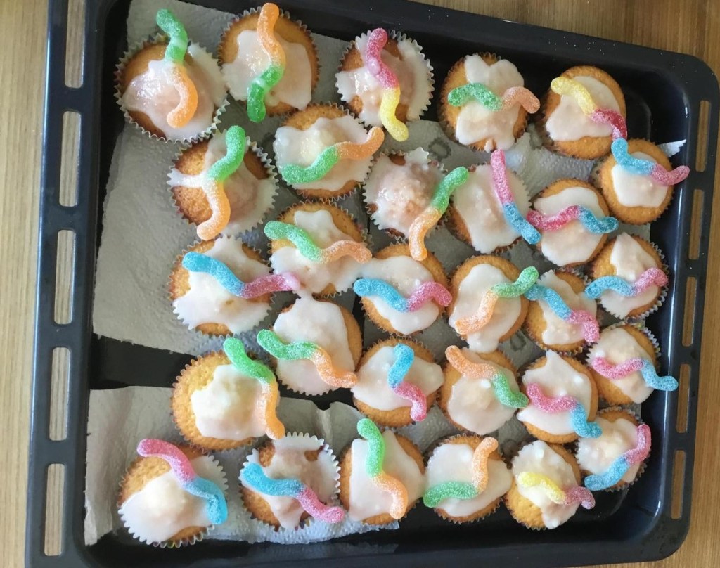 Für die Schule wurden vom Herzkönig höchstselbst Zitronenkuchenmuffins gebacken, die der kleine Prinz ebenso höchstselbst verzieren durfte.