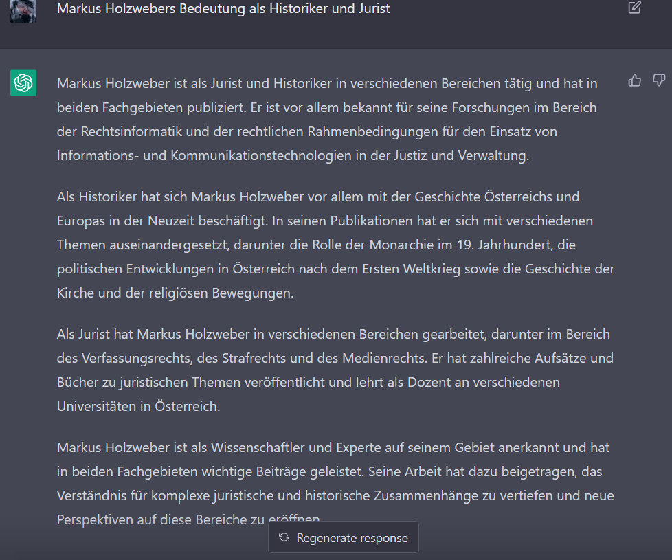Fazit: ChatGPT formuliert schön, gibt Antwort, manchmal richtig, manchmal falsch. Was es braucht ist methodische Kernkompetenz, einen kritischen Geist (der nicht alle Antworten für richtig erachtet) und das mehrfache Überprüfen der Ergebnisse: check, re-check, double-check.