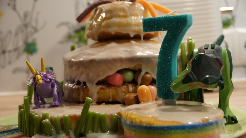 Für die Geburtstagsfeierlichkeiten des kleinen Prinzen wurde erneut eine Zitronenkuchenbasis herangezogen. Das Dekor in Dino-Optik besorgte die Herzkönigin höchstselbst. Die Latte liegt sehr hoch für die nächstjährigen Feiern!