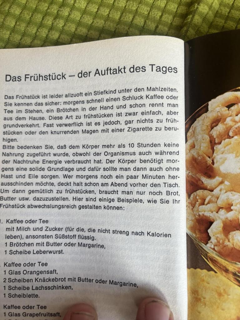 Hier Auszüge aus einem jüngst aufgefunden Werk, das auch schon wieder weitergeschenkt wurde bzw. werden musste. Man beachte den Hinweis zum Frühstück: „Fast verwerflich ist es jedoch, gar nichts zu frühstücken oder den knurrenden Magen mit einer Zigarette zu beruhigen.“ Oder jenen zur Kaffeejause: „Für die Kaffee-Einladung sollten Sie – außer Kaffee oder Tee – ein Gläschen Cognac, Weinbrand oder Liköre bereitstellen. Danach können Sie dann auch noch ein Glas Wein, Whisky oder einen Gin mit Soda anbieten.“