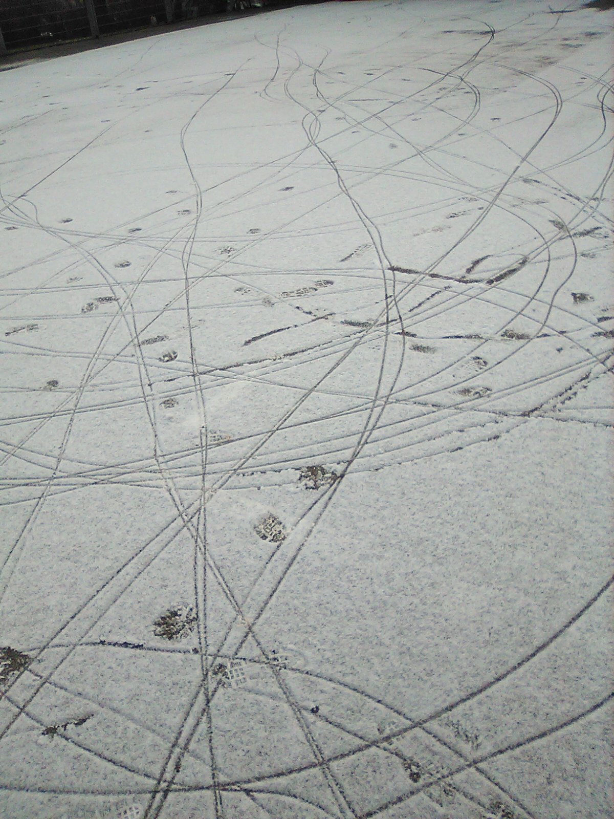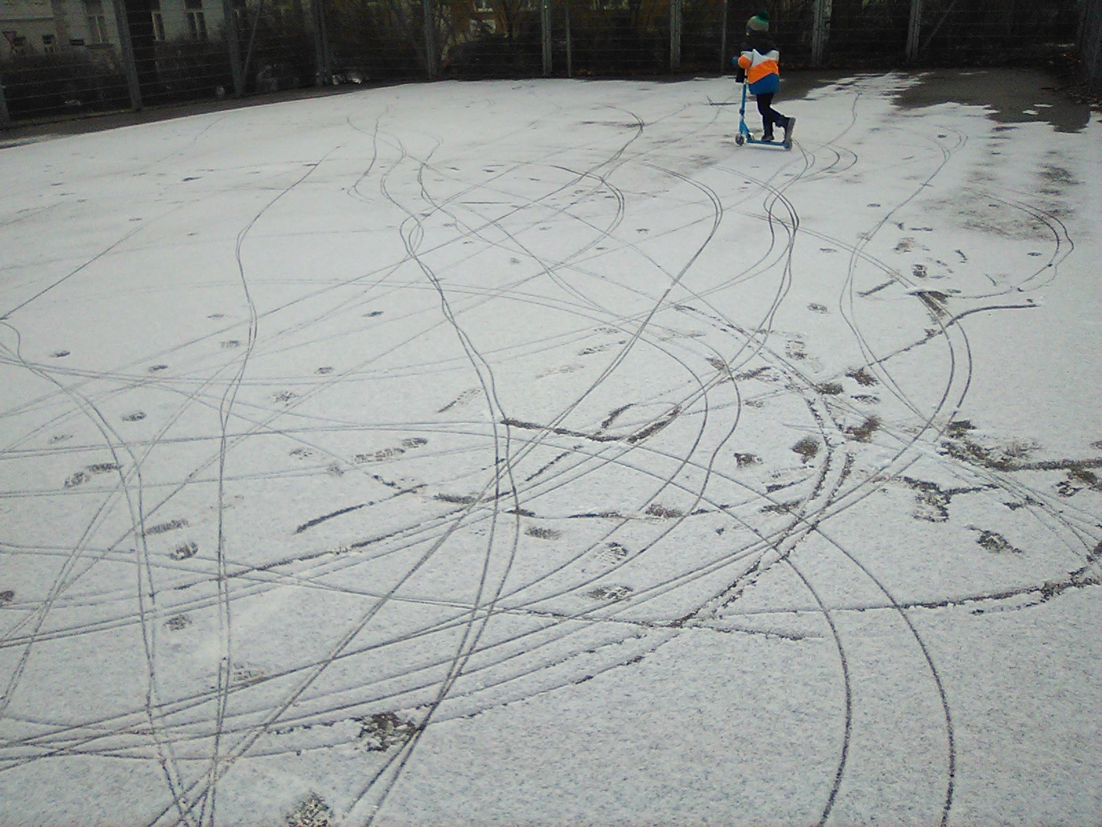 Über Nacht hat es etwas gescheit. Frühmorgens konnten der kleine Prinz und der Herzkönig noch Plätze entdecken, die von einer Schneeschicht bedeckt waren. Die beiden – die mittlerweile zu eingefleischten Rollerfahren geworden sind – konnten den frischen Schnee mit Spuren und Mustern übersähen.
