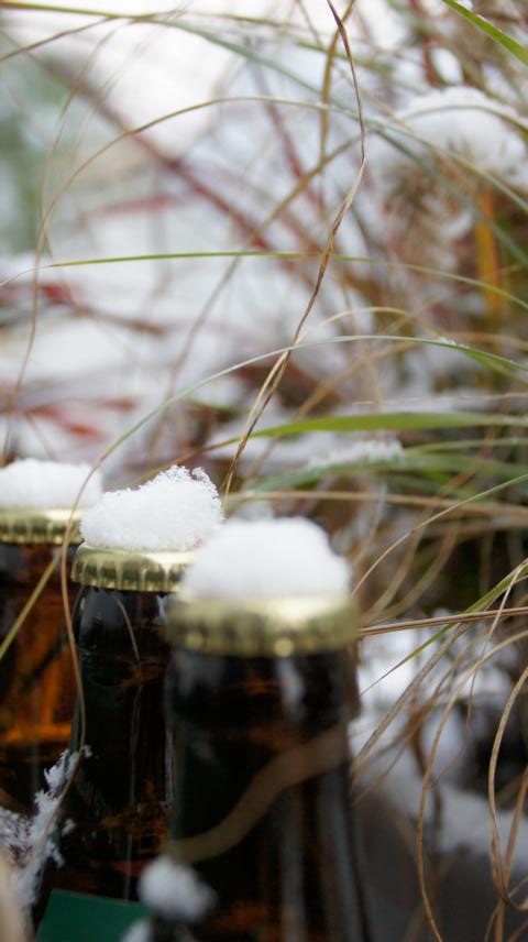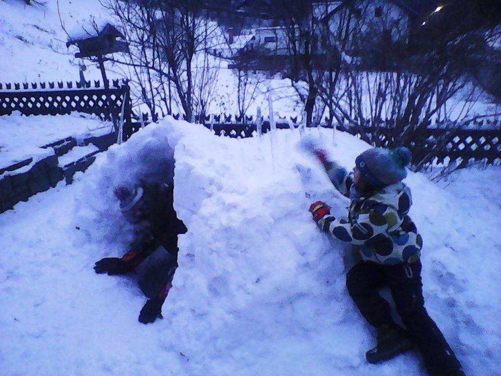 Also musste in niederen Lagen ein Schneemann gebaut werden; in Ermangelung von Karotten wurden als Nasen (und Ohren) Tannenzapfen genommen, als Haare dienten ein paar Zweige und als Augen zwei Zierquitten aus Omis Garten.