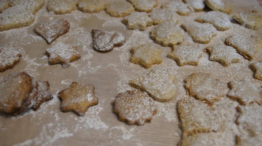Mit Verspätung wurde ein Teig geknetet und auf einer Staubzuckeroberfläche ausgerollt. Nach dem Formenausstechen – bei dem sich auch der kleine Prinz beteiligte – ging es für 10 Minuten ins Rohr (180 Grad). Dann gabs direkt nach dem Herausnehmen auf jedes Keks einen Guss aus einer dickflüssigen Masse (Zitronensaft vermischt mit Staubzucker). Zum Drüberstreuen wurde auch noch etwas Staubzucker darüber gesiebt.