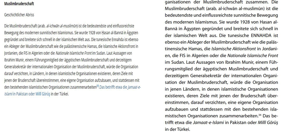 Spannender ist allerdings, dass im Impressum der Landkarte die zusammengetragenen Daten als urheberrechtlich geschützt erklärt werden. Um beim selben Verein zu bleiben. Dieser wird hier in die Nähe der Muslimbruderschaft gestellt. Daher wird diese Organisation in der Folge auch historisch beleuchtet. Dieser Text auf der 2021 veröffentlichten Landkarte basiert auf vielen Quellen aus dem Jahr 2017, ergänzt durch einige Links aus 2021. Damit lässt sich wohl auch erklären, warum das thematisierte Frauenprogramm 2017 noch immer aktuell ist.